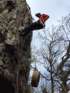 Le temps d’installer un système de poulies et les cordes pour l’assurage proprement dit et les costaud du groupe commencent à hisser un pneu bien lourd jusqu’à Antoine placé plus haut. Et au signal, le pneu est laché. A charge de chaque stagiaire de stopper dynamiquement la chute du lourdeau.